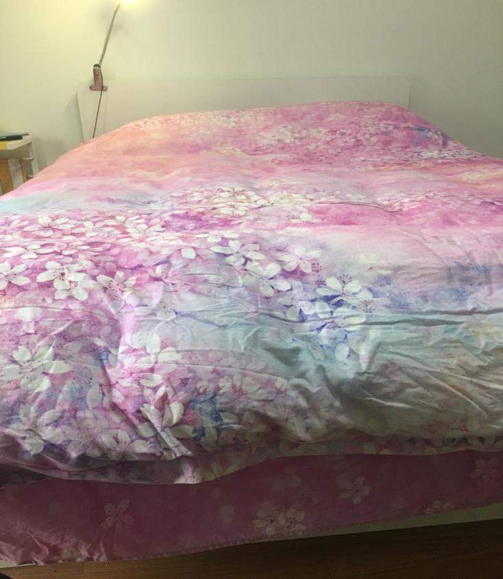 拉开拉链,开袋取出被子,感觉略显褶皱。虽然还没晾晒,也先扔上了床。虽然被子本身没有使用真空包装,但明显感觉到拿出后迅速膨胀了起来。向下压一压才使它勉强站在了床上。